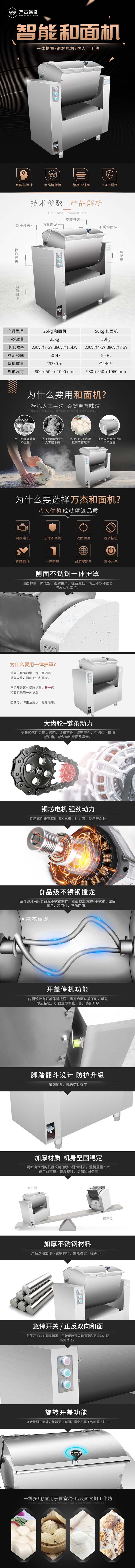 ■ 主要技術(shù)參數(shù): 一次和面量:25KG 產(chǎn)品型號:WJ-HMJ50A 一次和面量:50KG 額定電壓:380V 功 率:3.0KW 外形尺寸:980×550×1060MM 機器重量:220KG ■ 性能特點: 1. 采用腳踏翻斗,降低勞動強度 2. 具有掀蓋停機功能,集成線路板起過載、短路、缺相、過壓、欠壓保護作用,穩(wěn)定系數(shù)高 3. 采用銅線電機,配備好的減速機,穩(wěn)定耐用噪音低 4. 面斗部分采用好的不銹鋼制作,和面攪龍為304不銹鋼,堅固耐用,美觀大方 ■ 產(chǎn)品介紹: